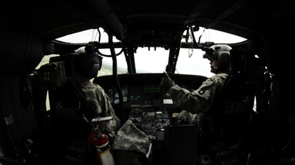 Medium shot of squad of special forces soldiers on military operation in jungle, commander using radio while transmitting data on laptop, and others covering him with rifles