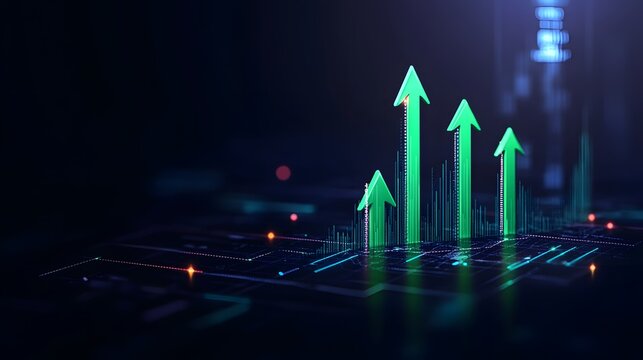 An abstract data landscape with green arrows pointing upwards, representing market optimism and the power of emerging technologies.