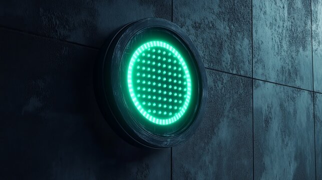 A green circular traffic light with a green backlight is mounted on a dark wall. The light indicates movement or a go signal. The image is a 3D rendering.