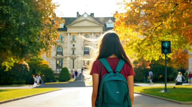 A green backpack rests on a classroom desk bathed in warm sunlight, capturing a quiet moment of school life and learning environment.