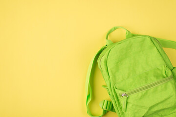 Green backpack with mesh market bag, bamboo cutlery  and  reusable coffee mug. Sustainable lifestyle. Zero waste, plastic free concept.