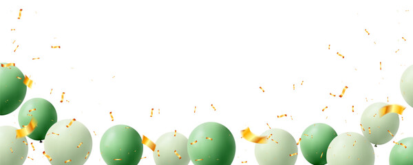 Celebration party banner with Green balloons isolated on white background. confetti and ribbons. Vector illustration