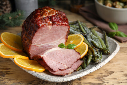 Delicious ham served with green beans and orange on wooden table, closeup. Christmas dinner