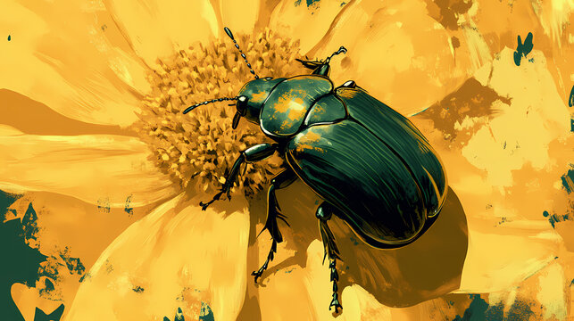 Vibrant green beetle on a yellow flower. Bloom Glitch. Illustration