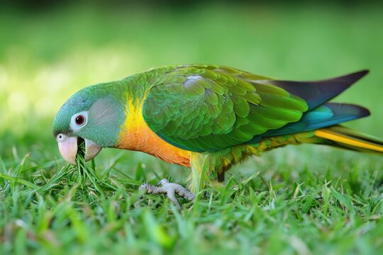A bright green and yellow bird enjoying a snack
