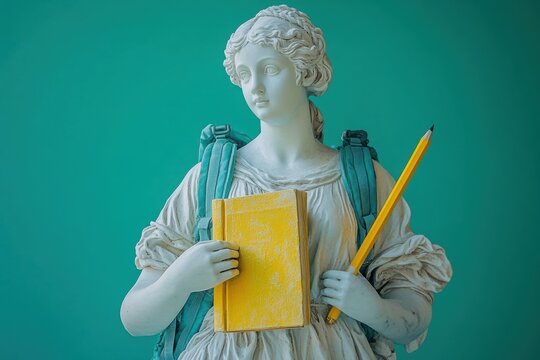 A classic white sculpture stands with a green book in one hand, a bright yellow pencil in the other, and adorned with a blue backpack, showcasing a modern twist to historic art
