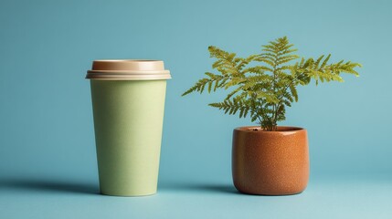 Eco-friendly still life with biodegradable coffee cup and potted fern for sustainable living or green branding content