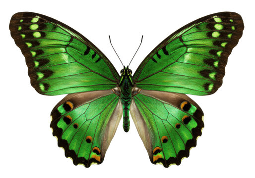 Isolated Green butterfly with patterns on wings, top-down view, with no background, symmetrical
