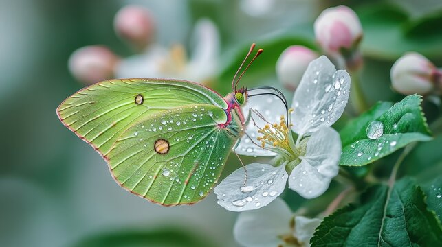 A stunning green butterfly with delicate wings drinks nectar from a dew-covered white flower, highlighting the beauty of nature in detail.