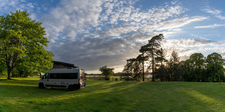 Aerial view of campground in rural area in Europe with many caravans. Concept of adventure and outdoor tourism in Europe.