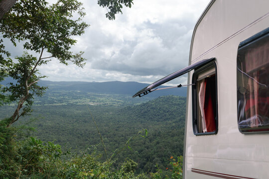 Close up part of camper van or caravan truck with window open parking at view point stop. Green relax freedom with nature mountain background