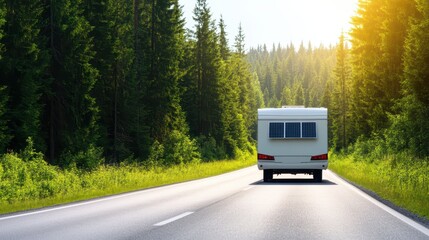 Aerial view Caravan trailer or Camper rv on the bridge over the lake in Finland.