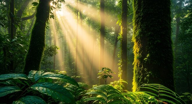 Sunlight breaks through the green canopy in a vibrant forest landscape