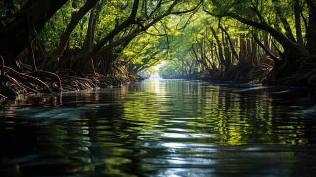 Enchanting sunlight shining through the lush verdant foliage of a tropical rainforest creating a magical and atmospheric scene  The dense green canopy filters the natural light casting a warm