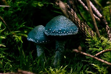 Bioluminescent mushrooms glow intensely with vibrant yellow and neon green caps illuminating dark forest floor debris and decaying wood structures
