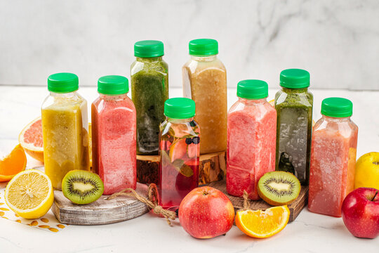 Close up of chilled bottles with green caps filled with red and orange liquid on a store shelf