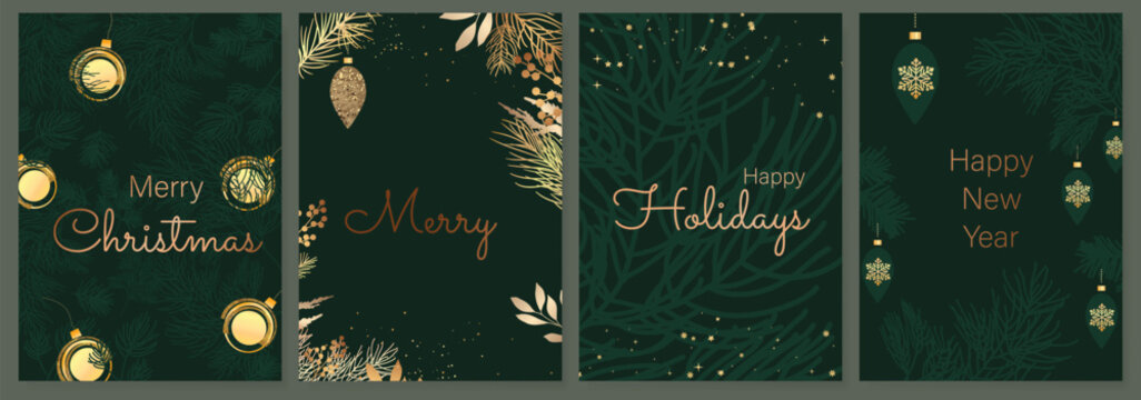 Luxury christmas invitation card art deco design vector. Christmas tree, bauble, gift, candle, envelope, spot texture on green background. Design illustration for season's greeting poster, cover.
