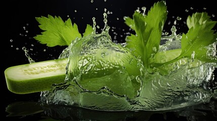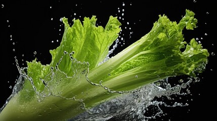 Closeup Fresh green celery exposed to water splash on black background and blur