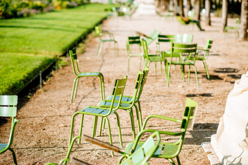 Famous green chairs at Tuileries gardens during the morning light in Paris