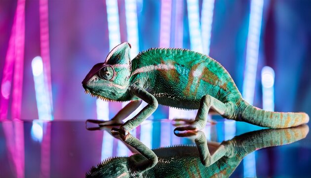 a green chameleon stands on a reflective surface with neon lights in background