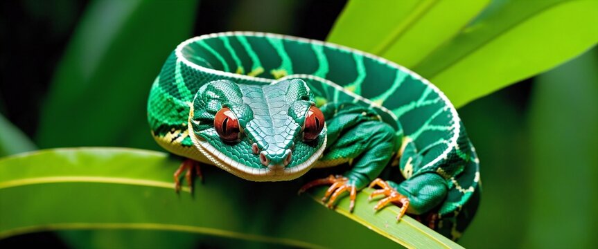 vibrant green chameleon perched on leafy branch