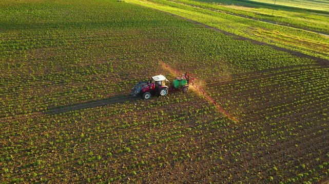 Pesticide Sprayer Tractor working on large green field at sunset. Aerial shot tractor spraying field. Agricultural land cultivation, farming business and husbandry