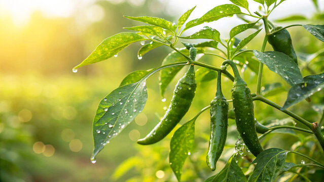 Green Chilies in field, Green Chilies with water drop in field in natural Background, Green Chilies Plant growing