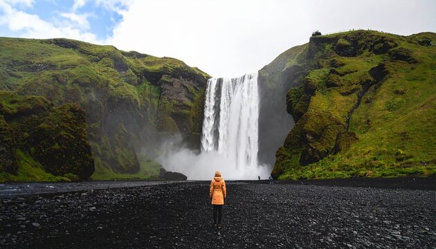 Majestic waterfall cascading down lush green cliff