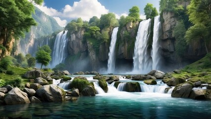 A stunning, serene waterfall cascades down a lush, green cliff into a clear,
