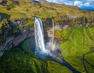 A majestic waterfall cascades down a lush green cliff, surrounded by dense foliage and a rainbow in the mist.