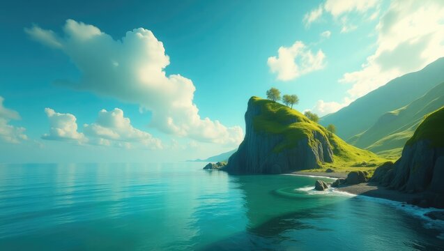 Surfers riding waves near a lush green cliff on a beautiful tropical island coastline
