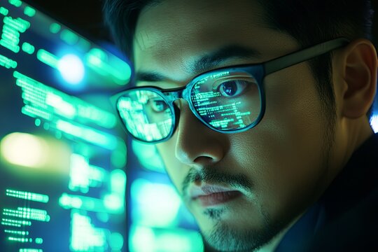 Hispanic man in front of his laptop with green coding  behind him on a screen