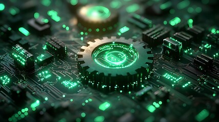 green cog circles shapes electronic cyberspace with arrows and neon light abstract high technology background