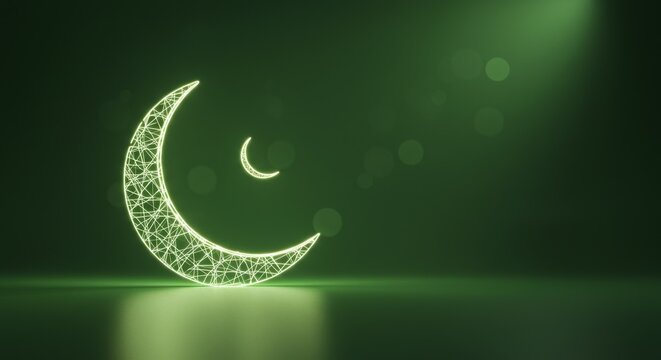 Emerald green & golden crescent moon emerald green background with golden islamic patterns and a softly glowing crescent moon. Crescent. Illustration