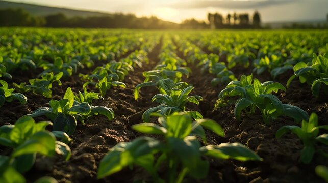 Rows of green crops in a field at sunset agriculture