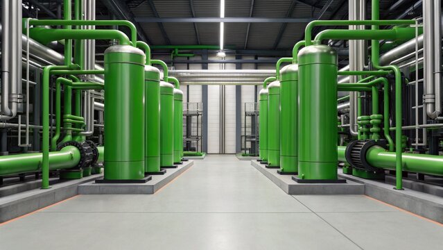 An industrial facility featuring a series of large green cylinders and pipes, showcasing modern infrastructure and engineering design.