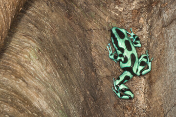 A poison dart frog sitting on a bare tree branch. Captive.