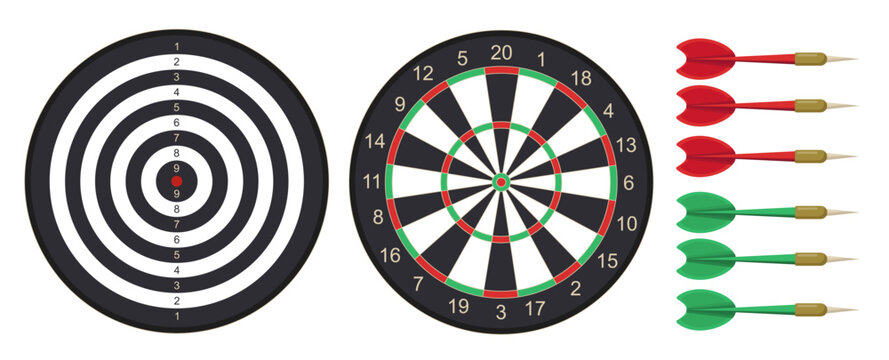 Dart board set. Red and green darts pack. Set for sports game, accuracy competition, tournament. Achievement and success, challenge. Flat vector collection isolated on white background
