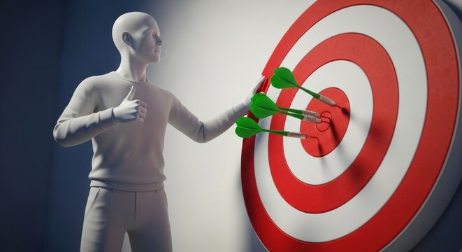 A figure gives a thumbs up next to a target with three green darts hitting the bullseye, symbolizing success, achievement, and goal attainment in business or personal endeavors.