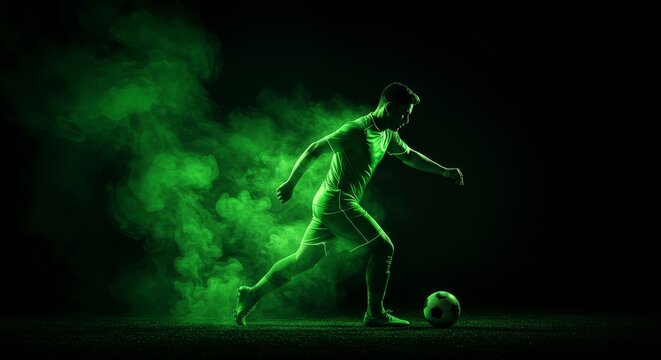 Green Smoke Soccer Player Silhouette - Futuristic soccer action, vibrant green smoke, dynamic pose, intense energy, athleticism
