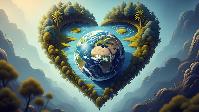 World wetlands day concept showing earth globe inside heart shaped water landscape with forests rivers and nature conservation symbolizing ecosystem balance and care