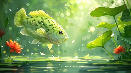 A vibrant green fish leaping above a serene pond surrounded by flowers and lush foliage.