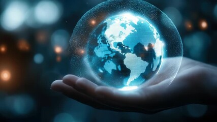 Earth care vision: Hand lifts globe reflecting human duty, digital aid, shared planet, tech purpose, unity goal, nature link, awareness rise, green focus, joint action, future bond, harmony drive