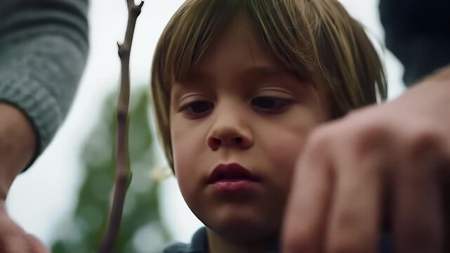 Close up of a young boy looking intently at a small plant held by adult hands. The background is blurred and green. Focus on the child and the plant.