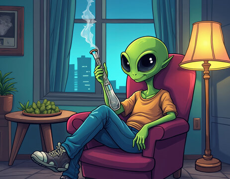 Green friendly alien character relaxes in comfy armchair at home. Smokes glass bong, cannabis buds on side table. Night city view from window. Creature enjoys calm evening, chill lifestyle, exploring