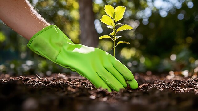 Close-up of hands in green gardening gloves gently placing soil around newly planted sapling, water droplets visible on leaves, shallow depth of field