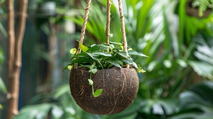 creative sustainable plant pot made of coconut shell with rope for hanging green gardening
