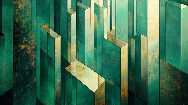 Abstract geometric patterns resembling graphs and bar charts, with shades of green and gold. Suitable for promoting financial growth, investment, or stability