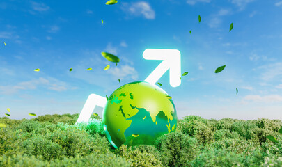Crystal green globe with growth arrow on forest background. Sustainable development Goals concept. 3d rendering.