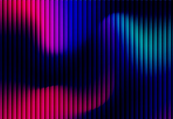 Abstract neon light waves behind vertical striped panels in a studio, featuring vibrant pink blue and green gradients for modern digital art backgrounds and design projects